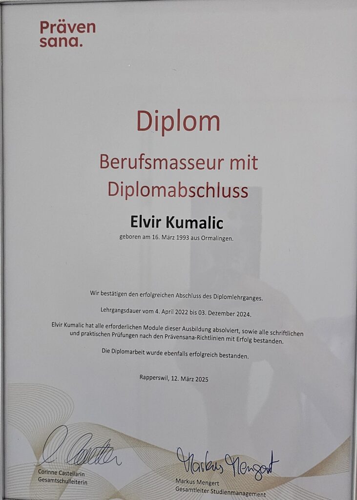 Aus diesem Antrieb heraus habe ich mich dazu entschieden mich zum Dipl. Masseur weiterzubilden und meine eigene Massagepraxis aufzubauen: Elvir’s Massage. Mit viel Einfühlungsvermögen, Erfahrung und einem ganzheitlichen Blick auf Körper und Seele biete ich klassische Massagen, Schröpfmassagen, Colonmassagen sowie Fussreflexzonenmassagen an.